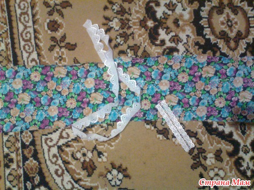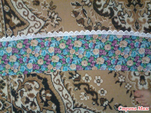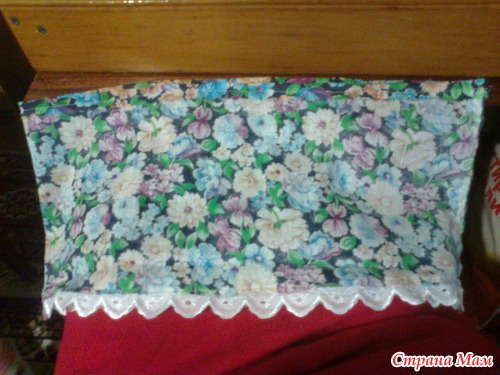 Одну сторону подшиваем, к другой пришиваем кружево, у меня остался кусочек, так что его использую для верха.