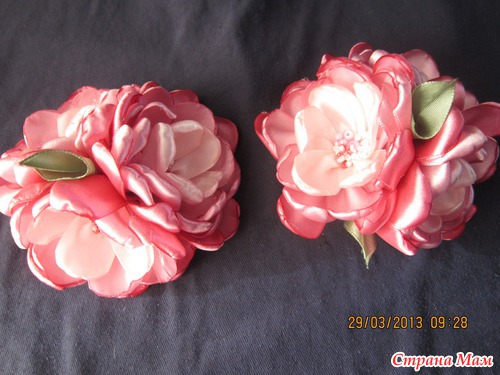 первая работа делала без мк ,могу на словах описать ,Из ленты 25 см вырезаете капельки лепестки на одну розочку 12-13 шт обжигаете над свечкой собираете на бусинку,в которую продета проволока ,просто легче потом букетик собрать ,но можно и без этого по принципу розы .Цветочки собираете в букетик бусинки петельки как позволит ваша фантазия ,по 2 цветочку мк здесьhttp://www.youtube.com/watch?v=Y-TSLtrglJg