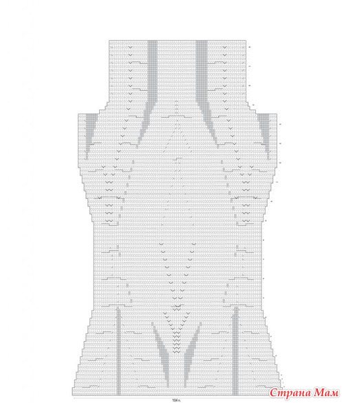 Спинка: набрать 90 п. и связать 4 р. двойной резинкой и 8 р. резинкой 2/2 (всего 4 см). Далее вязать по схеме, равномерно прибавив в 1-м р. 1 х 14 п. Через 2 см от резинки, следуя схеме, убавлять с обеих сторон после 12 первых и перед 12 последними петлями в каждом 4-м р. 11 х 1 п., одновременно выполняя убавления и прибавления в центре и меняя виды узоров. Через 39 см от резинки, следуя схеме, прибавлять с обеих сторон после 12 первых и перед 12 последними петлями в каждом 4-м р. 8 х 1 п. Через 63 см от резинки для скосов пройм закрыть с обеих сторон в каждом 2-м р. 1 х 5 п., 1 х 3 п. и 2 х 1 п. Через 17 см от начала скосов пройм отложить оставшиеся 60 п.