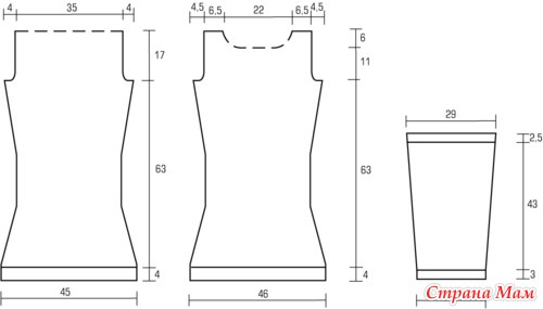 Перед: набрать 90 п. и связать резинку, как для спинки. Далее вязать по схеме, равномерно прибавив в 1-м р. 1 х 16 п., при этом провязывая с обеих сторон по 5 крайних петель изн. гладью (вместо 4 п., указанных на схеме) и делая прибавления и убавления, как для спинки. Через 63 см от резинки для скосов пройм закрыть с обеих сторон в каждом 2-м р. 1 х 6 п., 1 х 3 п. и 2 х 1 п. Через 11 см от начала скосов пройм для выреза горловины отложить средние 8 п. и заканчивать обе части раздельно, откладывая с обеих сторон от центра в каждом 2-м р. 1 х 6 п. и 2 х 4 п. Через 6 см от начала горловины отложить для каждого плеча по 12 оставшихся петель.