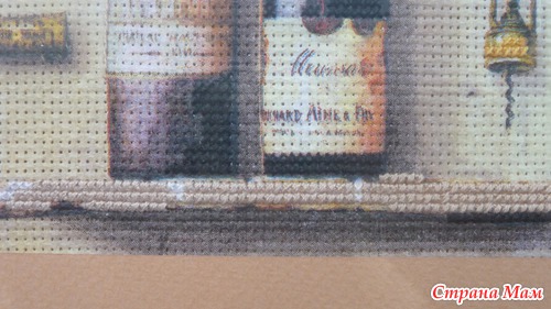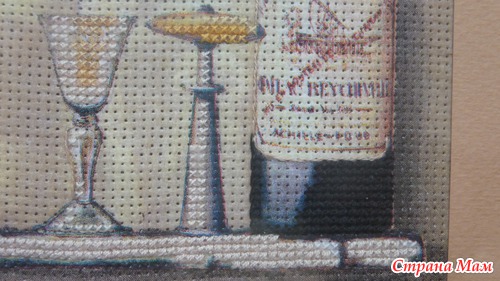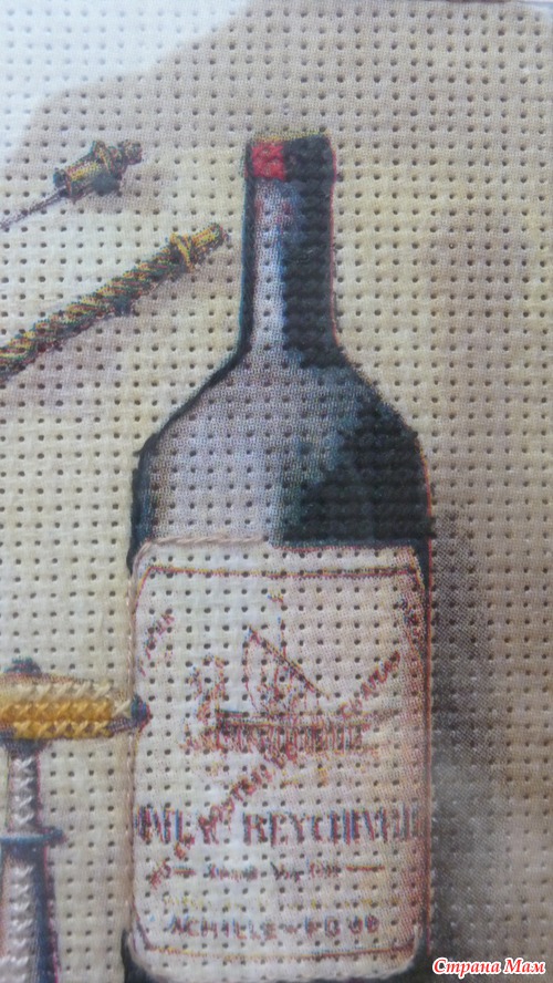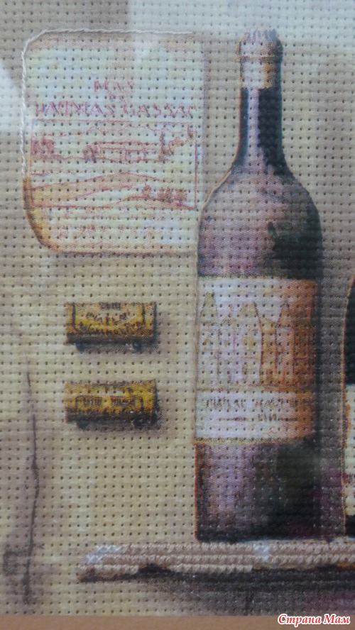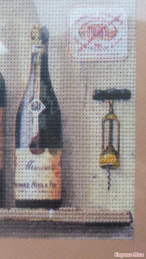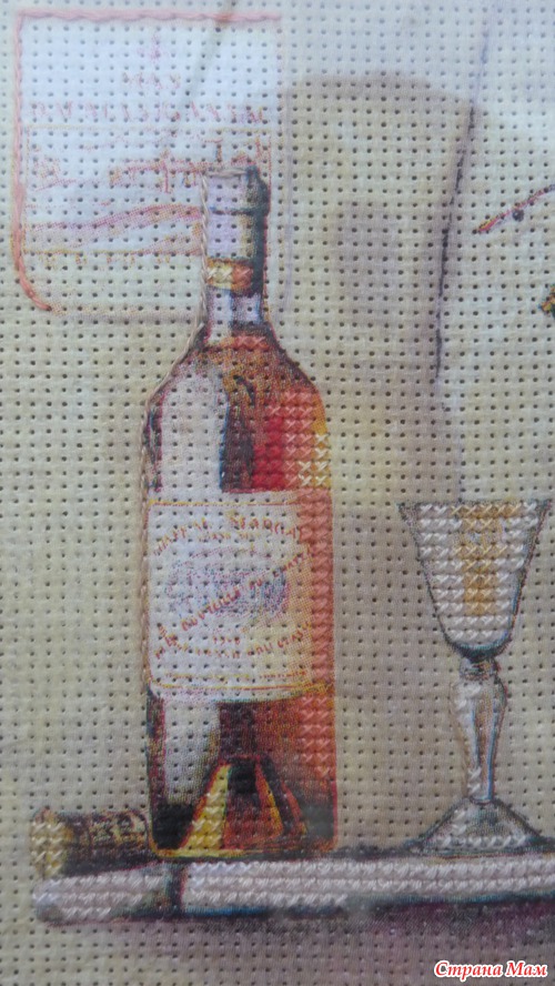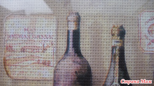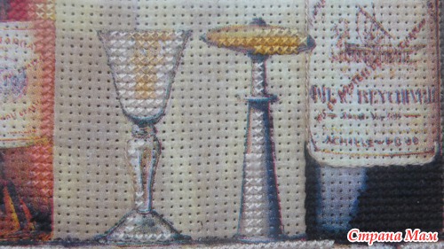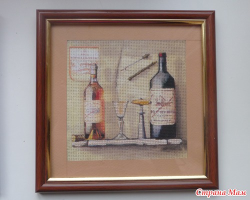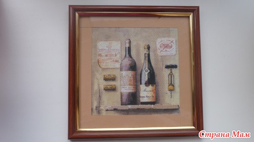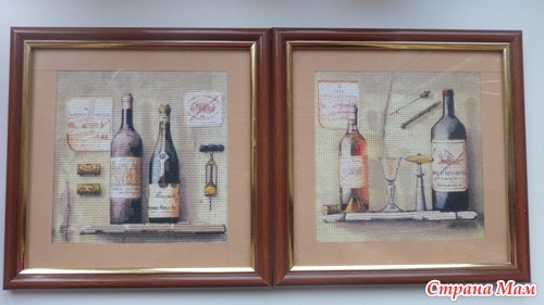 Приклеить тонюсенькую салфетку это, скажу я вам, дело непростое. Она так и норовит порваться, сложится по уголкам и приклеиться к самой себе, поэтому это довольно нервное занятие, но у меня получилось. Я приклеила два мотива на два куска канвы, всё это благополучно высохло, я продырявила это всё (очень скучное занятие). Но этого мне показалось мало. Раз уж это имитация вышивки, я решила, что надо добавить элементы вышивки. Я добавила крестики в одну нить, в две нити и что-то наподобии стебельчатого шва. Ниже я представляю подробные фото уже готовых оформленных картинок. Рамки подбирал и заказывал муж, паспарту сделал он из цветного набора картона. Картинки были подарены нашим кумовьям - любителям вина, и теперь они висят у них на кухне.