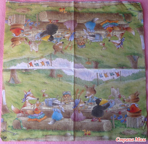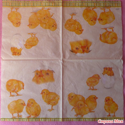 К сожалению процесс я не фотографировала почему-то, хотя люблю всё документировать. Для начала я попробовала это на обычное салфетке, которую не жалко (с рисунком конечно), чтобы набить руку, подобрать необходимую консистенцию клея и, конечно, не испортить затем нужную салфетку. Благодаря тому, что приклеиваем мы клеем ПВА (а это водорастворимый клей), неполучившийся материал мы без труда можем постирать и теряем безвозвратно только салфетку.