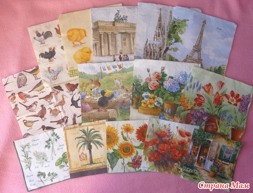 Мне настолько понравилась эта идея, что я захотела попробовать. Для начала прикупила салфеток. До этого я не пробовала технику декупажа, но представление о ней имела.