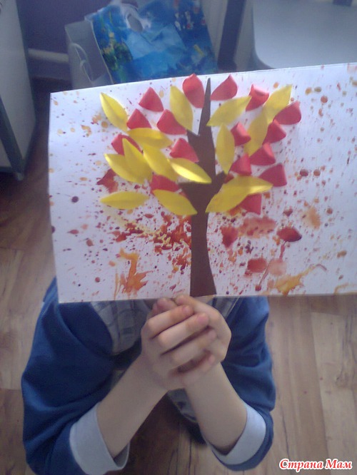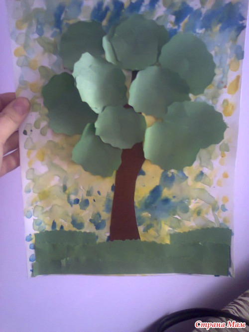 Лето "пропечатали" кистью. Использовав метод шаблона и многослойного складывания бумаги, выполнили аплекацию дерева.