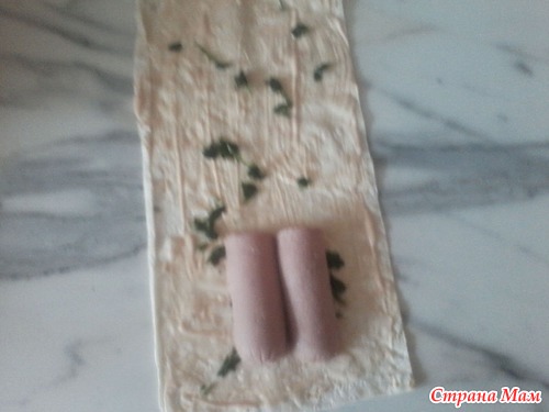 Лаваш разрезать на части (у меня с 1 листа 6 прямоугольников получилось).. смазать смесью майонеза и кетчупа, посыпать зеленью, положить кусочек сосиски