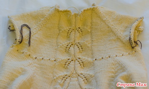 Когда количество петель спинки и переда станет равным, прибавления по линии реглана делаем через ряд везде. Вяжем таким образом, пока линия реглана не достигнет нужного размера. В нашем случае 18 см – это 3 листика.
