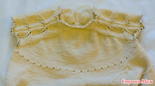 Остались рукава. Их вязала тоже вкруговую. Петли с бросовой нити перенести на спицы. Одновременно набрать крючком петли из воздушных петель (мы набирали для каждого рукава дополнительно по 4 петли). Чтобы рукав у запястья был поуже, в каждом 6-м ряду провязать 2 вместе лицевой. Рукав у меня получился 6 листиков. Затем вяжем перфорацию для ленты. И завершаем платочной вязкой. Обвязываем крючком.