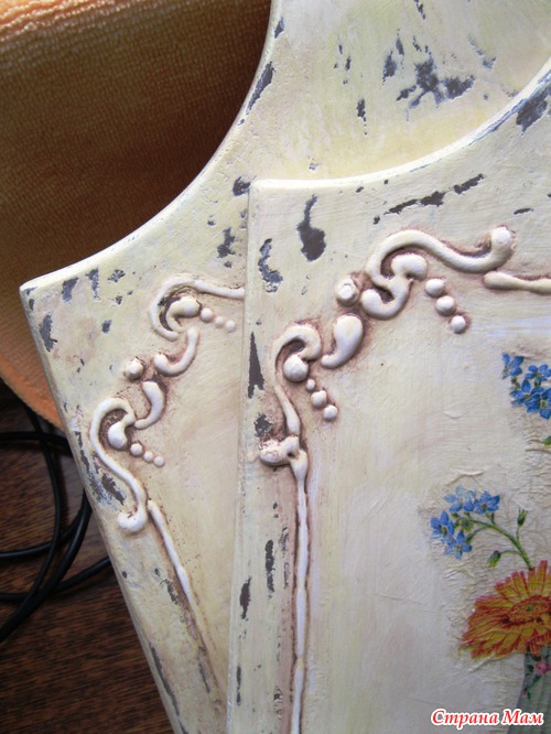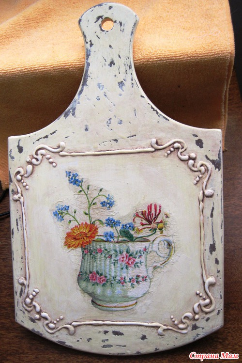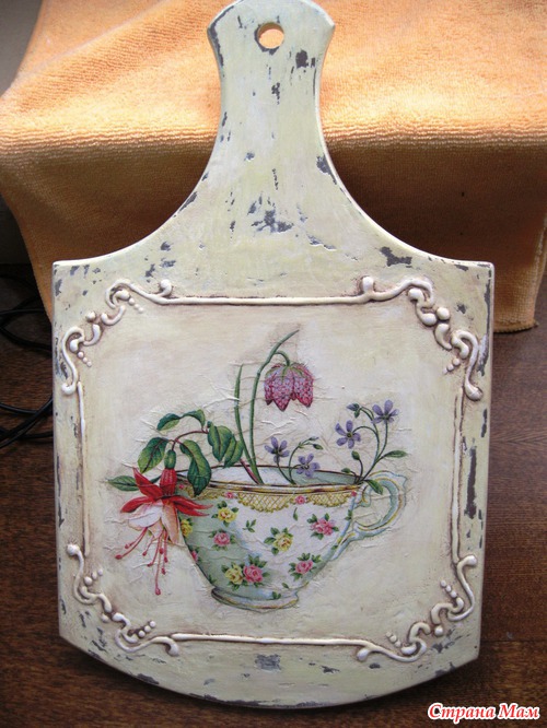 и тоже показать свои работы. Сегодня доделала вот такие досочки с объемным декупажем. Не совсем получился у меня шебби-шик. Но эффект старой-потертой-сто лет пользованной доски, по-моему, достигнут. Еще один "косяк" - никак не получается приклеить большой мотив из салфетки без морщин