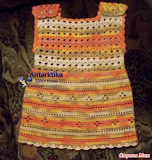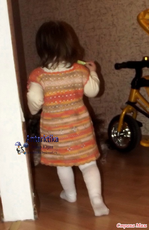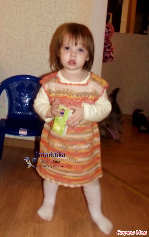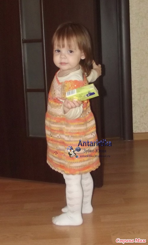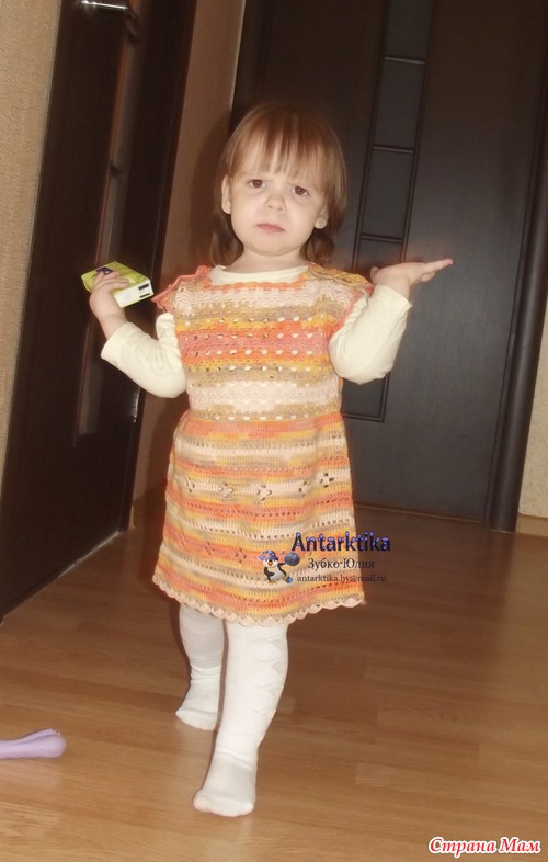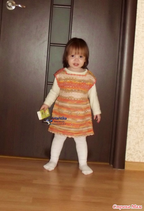 Связался доченьке сарафанчик на весну-осень.Ниточки Ализе Белла Батик, крючок - кокетка 2, платье 2,25-2,5. Расход на 2 годика 210 грамм примерно. Но на вырост, думаю прекрасно и ближе к 3 годикам будем носить.