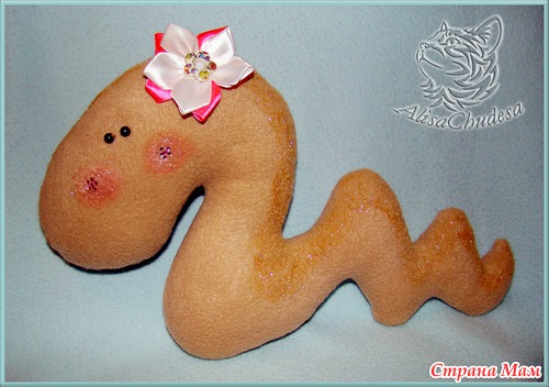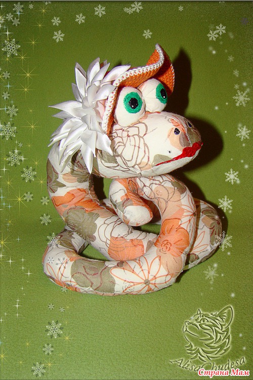 Кофейная змейка, живет дома, гламурная и вкусная)))) ткань-лен, шляпка из флиса украшена кружевом, сеткой и розами из лент