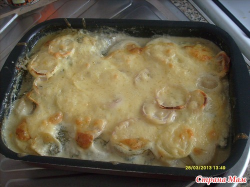 Затем складываем (по возможности плотно) в форму, сверху закрываем нарезанным луком и тертым сыром.