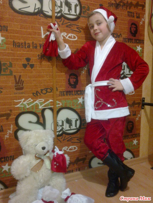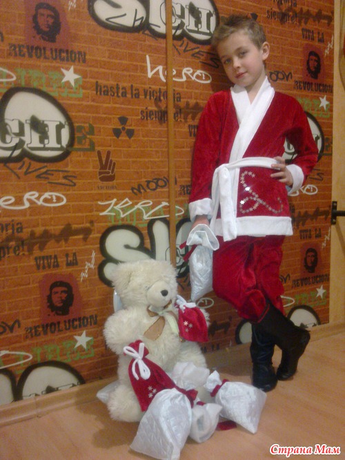 На одном дыхании и костюм и сапоги, и даже мешочки для подарков)) На спине вышито снежинками 2013. Фото позже добавлю))) На мешочках снежинки