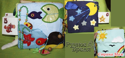 Страница 6. Считаем звёзды, подбираем определённый вид их крепления (липучка, 2 вида кнопок), прячем в месяц и под тучки. На этой странице дополнительно сделана страница День — перебирает ленточки на солнце, прячем птичек под солнышком. Учим понятия день-ночь.