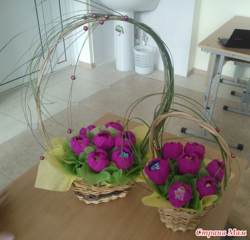 вот что значит, когда руки растут, откуда положено! А я попыталась свекрови на ДР сделать, то ли конфеты неправильные (она диабетик, я и покупала, что нашла без сахара - а они такой формы неудачной, как "маска"), то ли совсем муза покинула, ведь же делала когда-то пару раз букетики уже.... в общем, фигня получилась, оставила до Пасхи в надежде, что муза все-таки прилетит