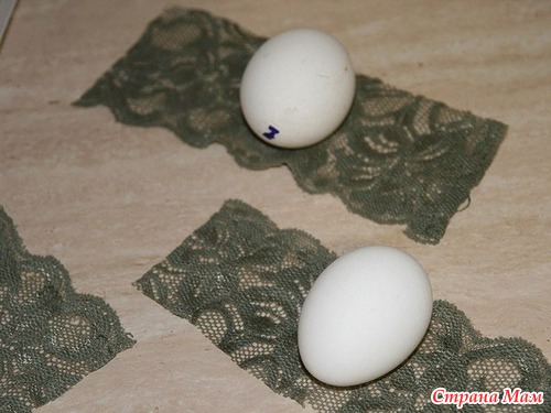 первый ряд справа, два нижних яйца - как раз те, что в рисе были обваляны. Третье- в шелуху было завернуто, а третий ряд, два верхних яйца - нитками обмотаны. Правда, нитки тонкие были, поэтому не слишком удачно получилось.