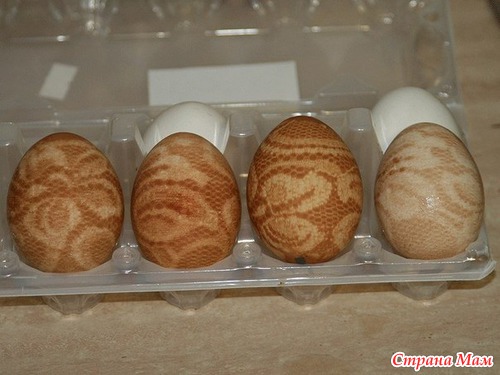 первый ряд справа, два нижних яйца - как раз те, что в рисе были обваляны. Третье- в шелуху было завернуто, а третий ряд, два верхних яйца - нитками обмотаны. Правда, нитки тонкие были, поэтому не слишком удачно получилось.