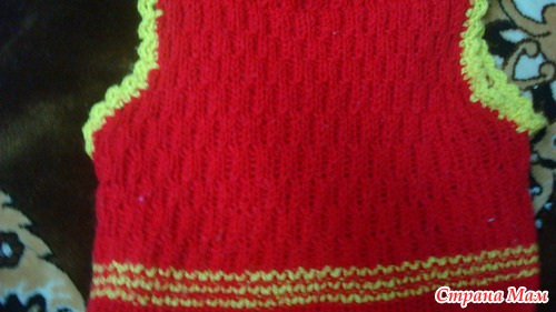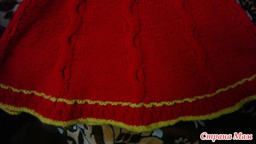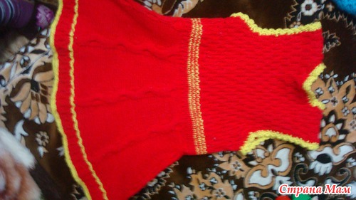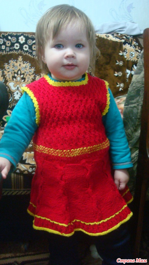 Привет всем заглянувшим) Связала дочурке сарафанчик для детского сада. Нитки Беби красного цвета 100% акрил 100 гр и желтого цвета не помню какие, остатки тоже акрил. ушло 1 моток красного и чуть-чуть желтого