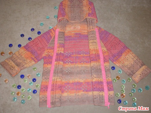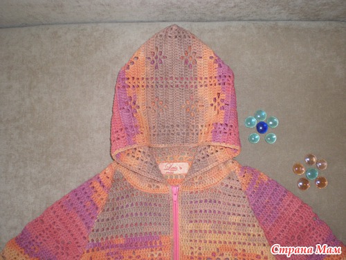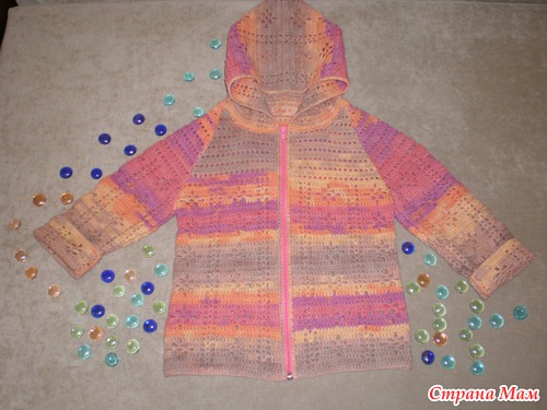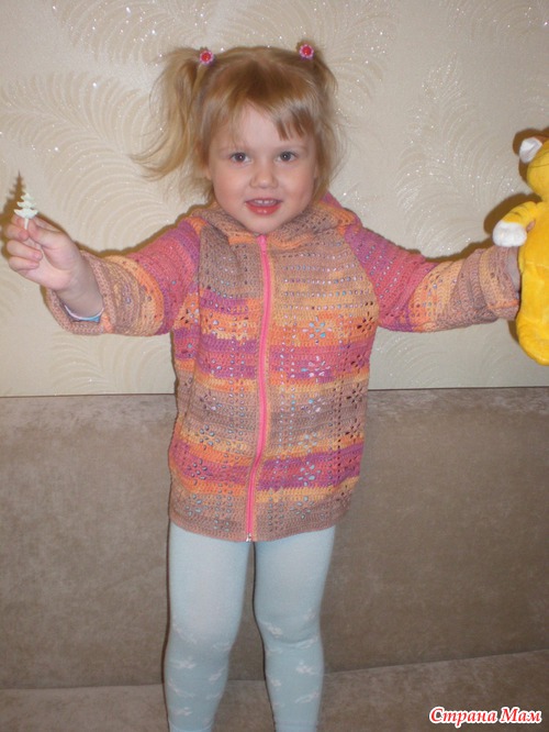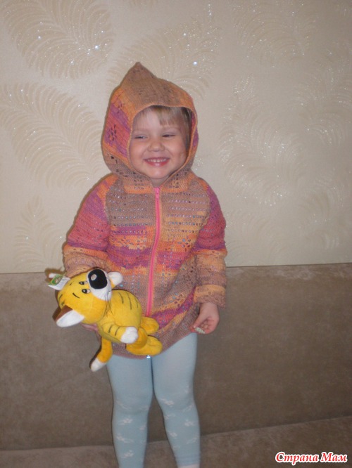 Всем привет!!! Вот наконец-то довязала кофточку с капюшоном для дочки. Связана из пряжи COTTON GOLD BATIK 55% хлопок 45% акрил, 330 м, 100 гр., цвет 3557, крючком 2,75, ушло 2,5 моточка, молния 40 см