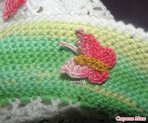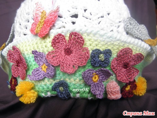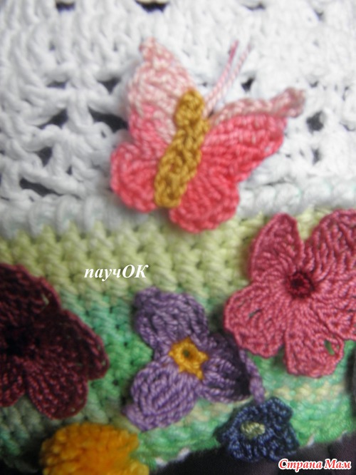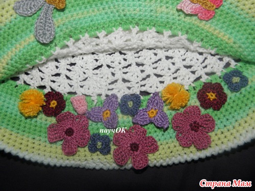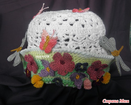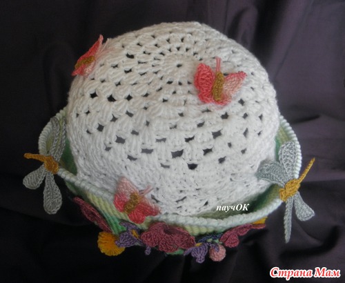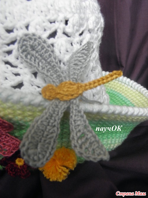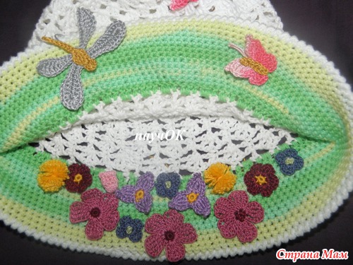 просто оч лета хочеться, да и случайно как-то получилось - завалялся 1 моток зеленой беллы, тут на глаза попалась схема бабочек, тут стрекозу попробовала и так все и слепилось, хотя задумка изначально была простенькая панама с цветком и 1 стрекозой