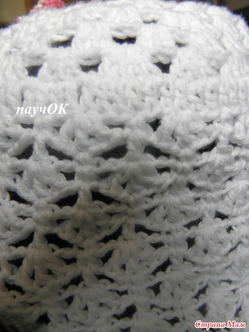 панама по обычному стандарту - блинчик нужного размера, далее без прибавок любой ажурный узор до нужной глубины, поля - ст без накида (прибавки делала в 2-х рядах в каждой 10-й, а в след ряду в каждой 11-й петле). последний ряд - рачий шаг.