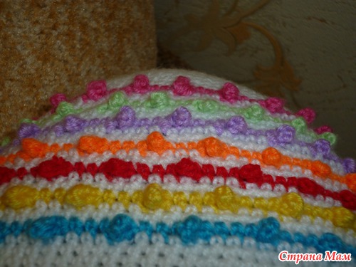 Вяжется очень просто:когда начинаете цветную полосу 3ст/бн столбик с 3 накидами и так весь ряд,затем ряд белой нитью,потом берете нить другого цвета и вяжете чтобы шишечки были в шахматном порядке,эта шишечка получается из ст с 3 нак,если что-то не понятно спрашивайте