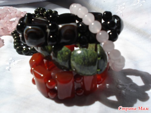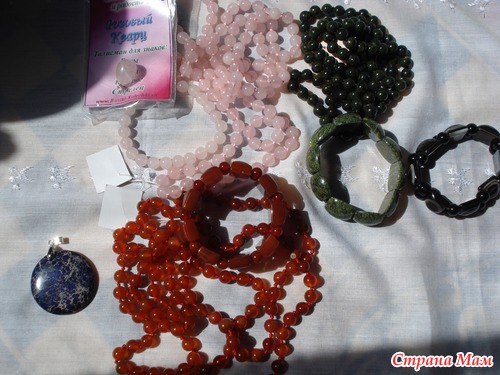 Вот что мне пришло: бусы и браслет из змеевика, бусы и браслет из сердолика, бусы, браслет и подвеска из розового кварца, подвеска из варисцита и самый мне приглянувшийся браслет из агата (удачно сфоткать не получилось