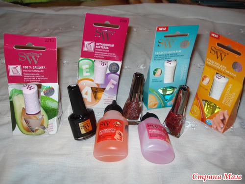 это мну любимой, лаки и лечебные всякие бальзамы, защитные покрытия для ногтей, жидкости для снятия лака без ацетона. Уже опробовала лаки и жидкость - класс! Кракелюр - кракелюрится, жидкость снимает лак очень хорошо.