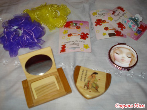 ну и для дочи немного заколочек, резиночек, зеркальце с куклой( прикольное - кукла глаза закрывает)
