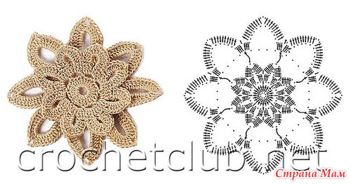 Думаю многих заинтересует цветок на голубом сарафане. Визуально все в восторге от него. Поэтому заранее поделюсь схемкой