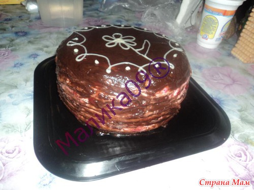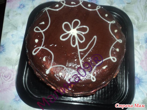 4ч.л-какао+3ст.лож.сахара.,+2ст.лож.сметаны=перемешать и тапить на огне.Потом добавить 70гр. сливочного масла.проварить до среднего загустения.Дать чуточку остыть и покрыть торт.(Глазурь лучше сделать полторы-две порции)