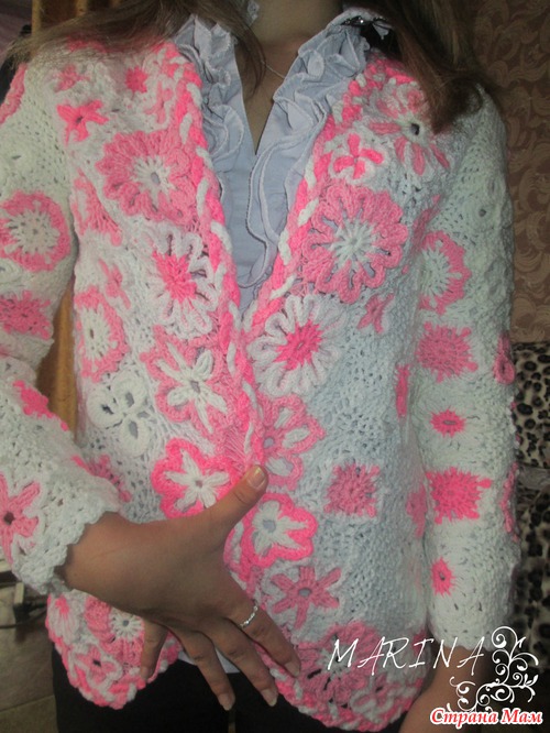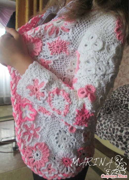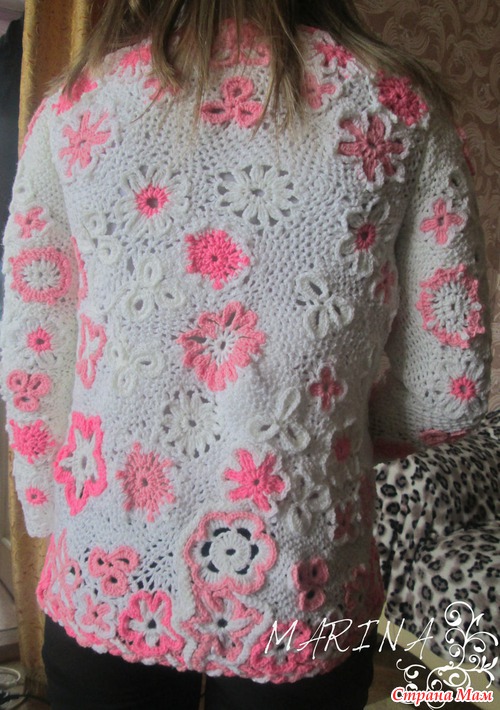 смотрю и думаю... что то забыла?! А вот что не могу понять... Совместила две техники вязания... фриформ и ирландское кружево... Девочки подскажите как смотрится... говорю сразу... дочка носить будет без замочков и пуговиц, рукав чуть больше четверти.. заказала вот так... А по мне так что то не хватает... вот только не пойму чего