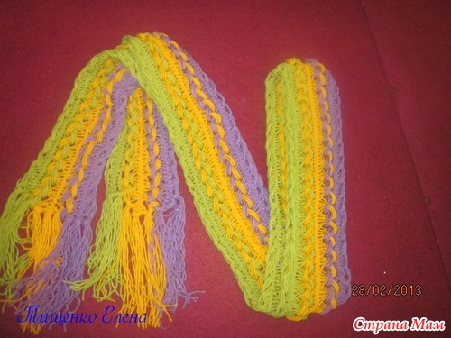 Я брала по мотку каждого цвета- сначала на бахраму оставила, а потом с меньшего мотка ( были разные фирмы пряжи)- начала- посчитала петли и так же сделала еще две полосы, Вязала на самодельной вилке шириной 10 см.