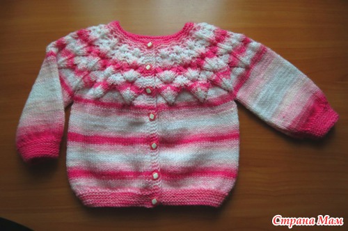 На 2-3г. Схему круглой кокетки брала здесь http://www.liveinternet.ru/users/4698853/post212422137/ вариант 1( до38 ряда). Вязание от горловины-81 п -8 рядов платочной вязкой, затем разделила(18 клиньев+ 2кромочные+для планки по 3 с обеих сторон и 1п для симметрии). После 38р (225п) прибавить 19п, разделить на рукава(по 52 п), спинку(68)и перед (36+36) вязать вместе+4п=144п 42 ряда лицевой гладью, убавить до 106п и вязать 12-14 р платочной вязкой.Рукава тоже 42 р после кокетки, убавить затем до 32п и 14 рядов платочной вязкой.