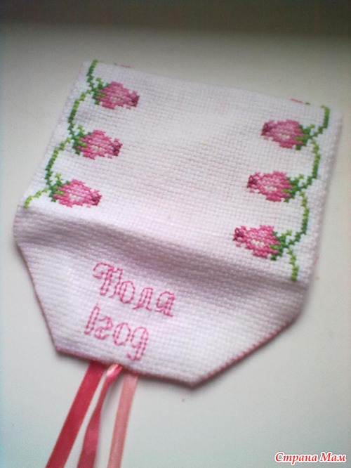 узор и вышила. Сшила по бокам бэк. И втянула ленточки( на концы прицеплю может какие бусинки, а может и нет_дома подходящего не