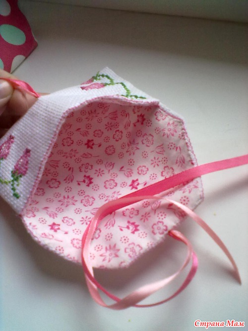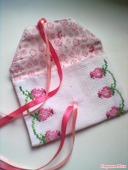 узор и вышила. Сшила по бокам бэк. И втянула ленточки( на концы прицеплю может какие бусинки, а может и нет_дома подходящего не