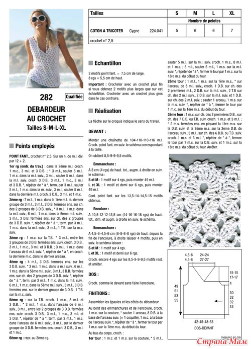 Вяжется вот по такому же принципу, как этот пуловер из нового номера "Маленькая Diana", только добавляется арочки из 5 в.п в 1-ом ряду и 11 в.п. во втором ряду и число столбиков в группе на один больше. Ориентируйтесь по цвету. Каждый ряд обозначен разным цветом