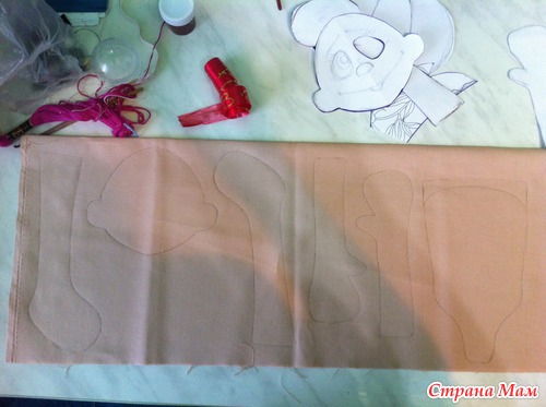 Приступаем... Переносим вырезанную предварительно выкройку на ткань. Я пользуюсь обычным мягким карандашом. Ткань можно и оттонировать кофе, если нет телесной. Берется для этого таже бязь белая. В интернете много рецептов тонировки, можно подсмотреть.