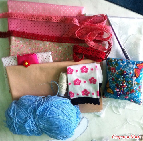 Для заказа, я брала американский или корейский хлопок, телесную ткань для тела, в дальнейшем белую бязь для крылышек и тесемочки, кружева, один носочек, бархат для тапочек, шестяные нитки для волос, нитку - резинку, пуговки и т. д, Для наполнителя холофайбер ( я подушку распарываю), синтепон. Это мой набор.