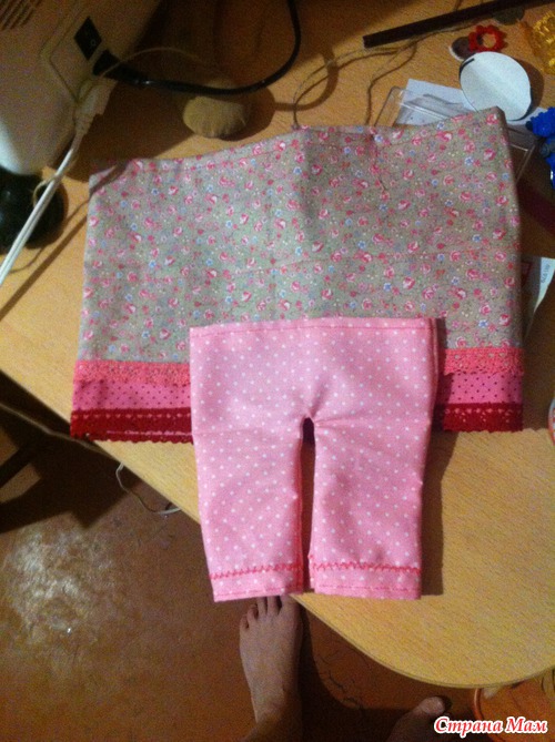Штанишки тоже взяла прямоугольник. Предварительно померила прям по кукле, что бы она был больше со всех сторон, с боков на 2-3 см, верх и них по 1 см, для подшивания. обрезала посередине, чуть больше половинки, для ножек.