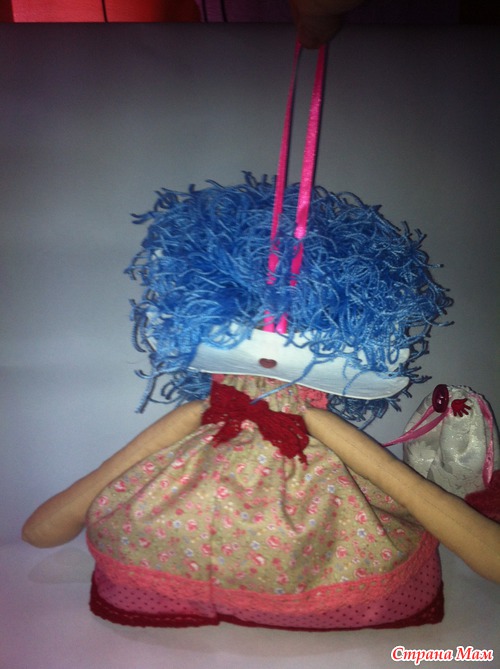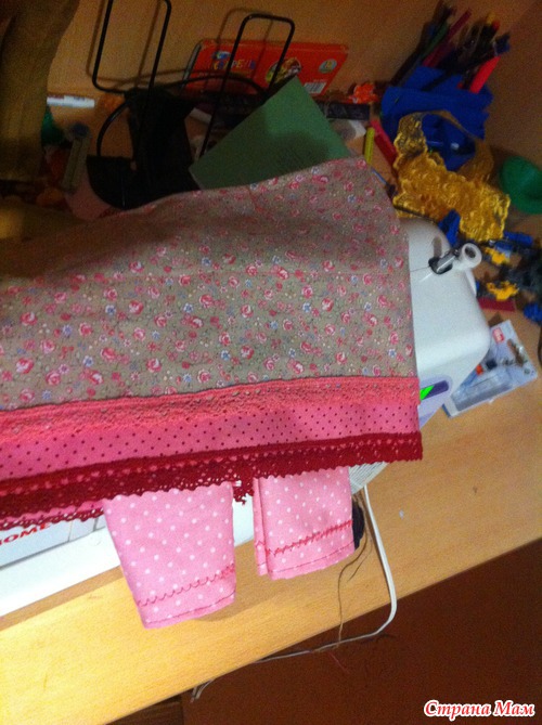 Да и не делала я ее вовсе, а так... взяла 2, вернее 3 куска ткани. Для платья 2 прямоугольника размером 20 в высоту и 35 в длину (Для основы платья). И чуть меньше в высоту 10 см для подклада, прострочила рюшками-кружевами, вот так получилось