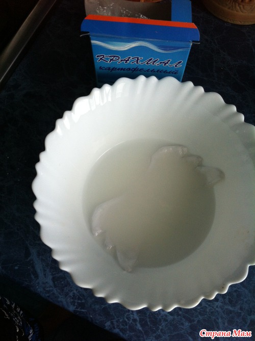 теперь берем волшебный раствор с крахмалом, я брала 2 ч. л. на 100 мл. воды холодной ( примерно меньше стакана)