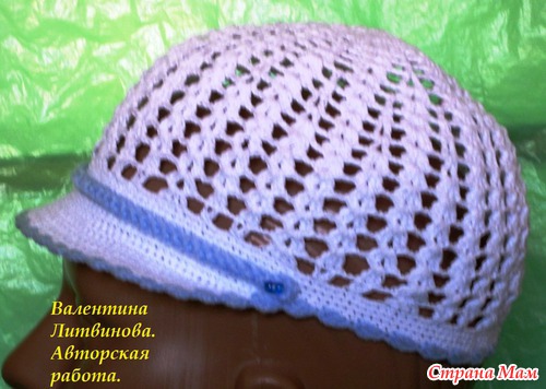 Донышко вяжется по кругу равным размеру головы ребёнка любым рисунком. Затем вяжем по схеме: два столбика с накидом, две воздушных петли, два столбика с накидом в одно отверстие. Козырёк - несколько рядов столбиков без накида. Всё хорошо видно на фото. Надеюсь, Вам понравится