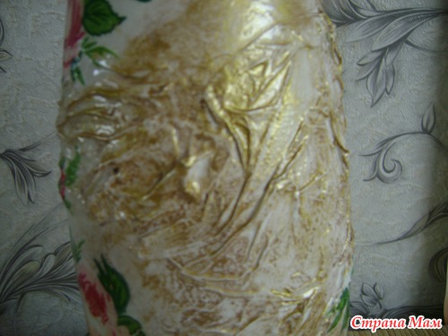 Два слоя белого акрила, в промежутках лак акриловый. На ПВА+вода салфетка. Сразу формировала складки. Далее белый акрил, лак, белый акрил, лак. Затем приклеила салфетку, покрыла лаком слоя 2 или 3 (уже не помню ).Далее на тряпочку коричневую краску и затирала складки, и не только. А потом поверх коричневой краски , также тряпочкой втирала в складки золотую акриловую краска. И опять акриловый лак 2-3 слоя