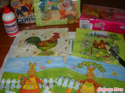 Что случилось-не знаю!!! Нахлынул такой энтузиазм, что ели дождавшись утра, я быстренько побежала на поиски салфеток, т, к хомяк не спит, набралась всяких салфеточек(большинство с пасхальной тематикой ), я приступила к творению!!