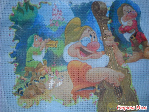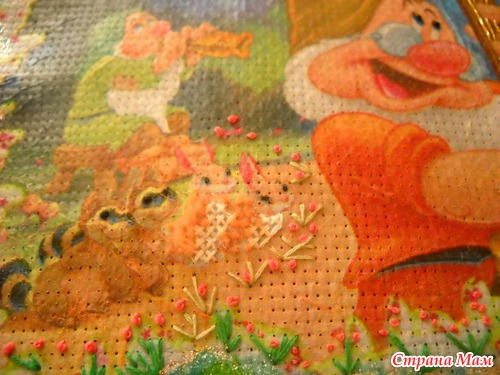 решила добавить немного "крестиков"(для зайчиков), французкий узелок(на глазки и цветочки), струны -для контрабаса, пояс для гнома, ой забыла-мохеровые шубки(зайкам)