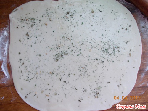 делаем тесто на штрудли или покупаем в магазине))) у меня в этот раз пресное, осталось с грузинчиков, раскатываем пласт, мажем его маслом, я посыпаю зеленью, можно выдавить чесночка