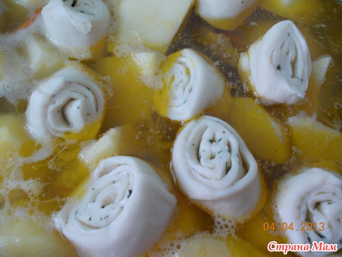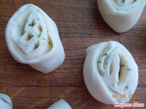 скатываем рулетиком не плотным и режем на кусочки где то см по 4-5