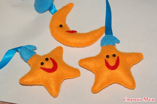 Не смотря на то, что я уже давно состою в группе и наблюдаю за творчеством участниц, сама с фетром не работала, только с флисом. И вот незадолго до рождения малыша я наконец решилась попробовать. Оказалось, что работать с фетром очень интересно и легко! Теперь в планах покупка фетра разных цветов, так как у меня в запасах очень скудный выбор. И идей много, но это будет позже, когда появится время. А пока покажу свою первую работу из фетра - игрушки для мобиля в детскую кроватку.