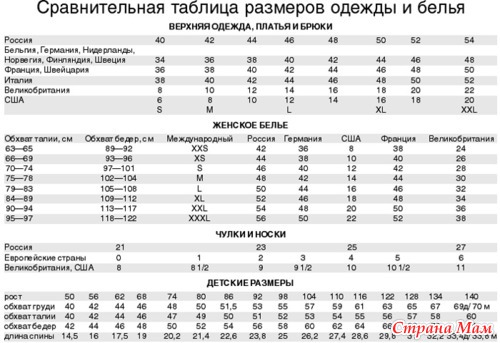 Таблички соответствия размеров одежды