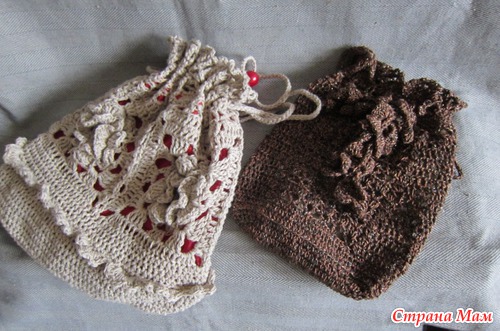 Разница с мешочками только одна - обе половинки вяжутся отдельно и потом соединяются ленточкой.